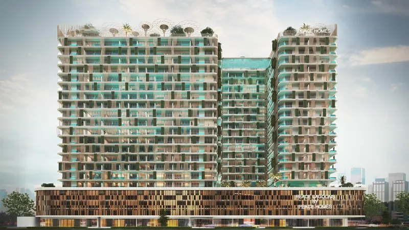 Experience the epitome of luxury living at Peace Lagoons by Peace Homes Group, an exceptional residential development with studios, 1 & 2-bedroom apartments located in the prestigious Dubailand Residence Complex (DLRC). Boasting an innovative design across 17-storey with unparalleled amenities, the façade redefines modern living in Dubai. Nestled amidst lush greenery and shimmering lagoons, this residential haven offers a serene oasis away from the hustle and bustle of the city.